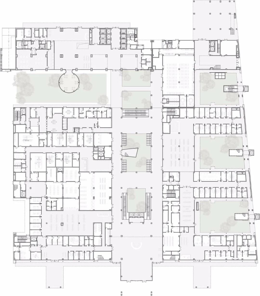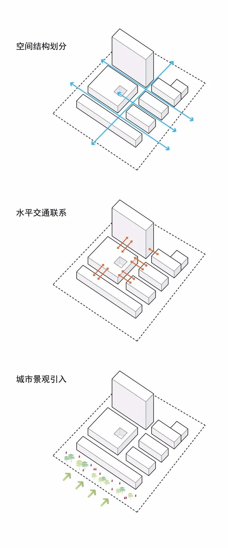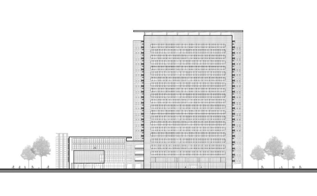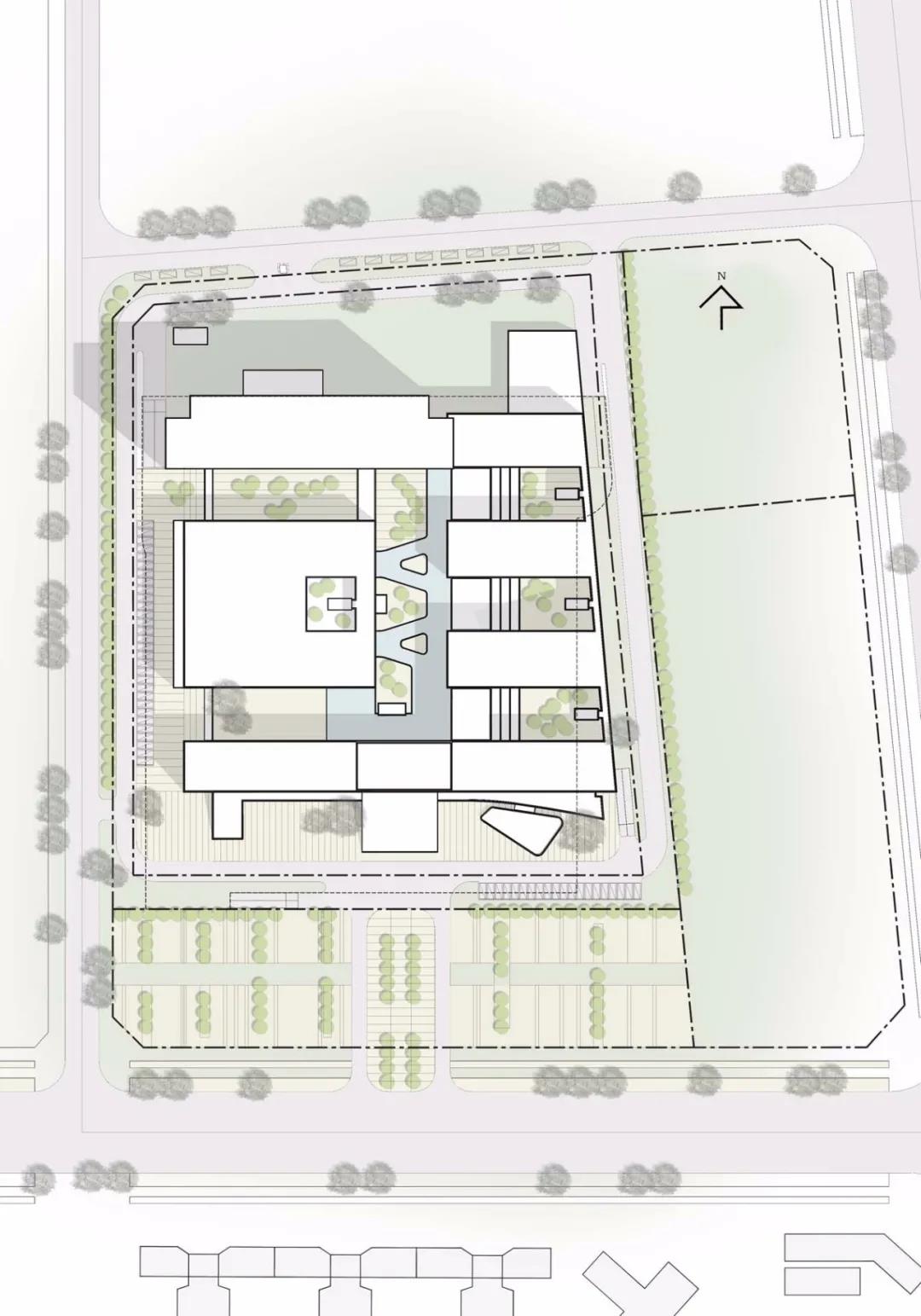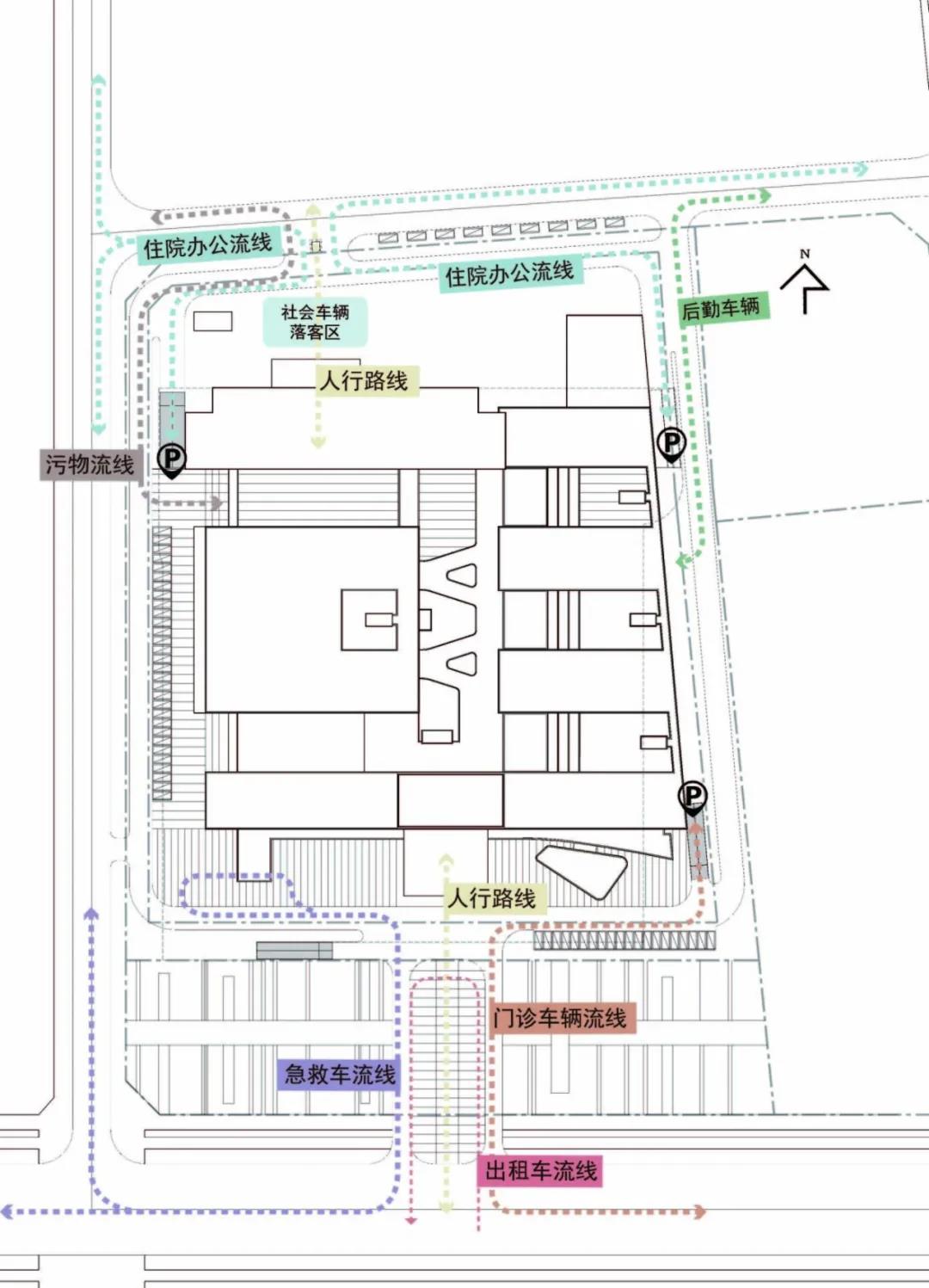 CAPOL負(fù)責(zé)進(jìn)行從方案到施工圖全過程的建筑設(shè)計(jì)總承包工作,創(chuàng)造性地采用“緊湊型三角形結(jié)構(gòu)”:以醫(yī)療技術(shù)部門為核心,門診部將布置在人流較多的城市主干道,住院部是遠(yuǎn)離城市主干道和噪音源的。三角形布局形成的最短會(huì)診、急救流線和分層掛號(hào)系統(tǒng),創(chuàng)造出了高效的就醫(yī)體驗(yàn)。