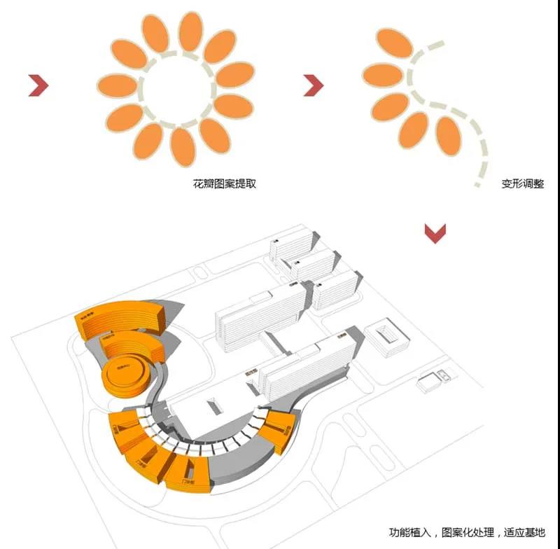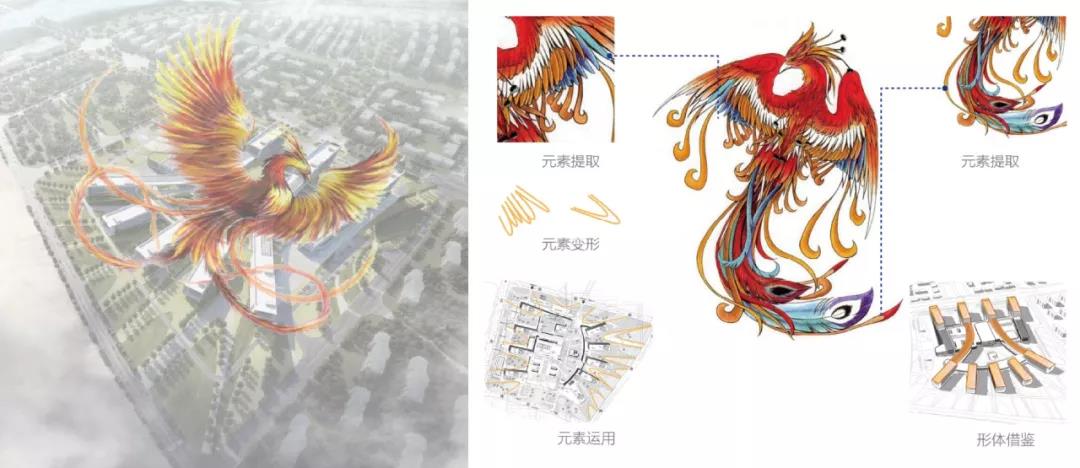 日出東方、火鳳騰飛——方案延續(xù)當(dāng)?shù)貙μ柕某绨菁傍P凰城遺址的歷史文化積淀,取意象征太陽的神鳥鳳凰,將鳳凰羽翼和尾翼的線條進行提煉演變,形成建筑和景觀的構(gòu)成元素,表達了對歷史和文化的呼應(yīng)。