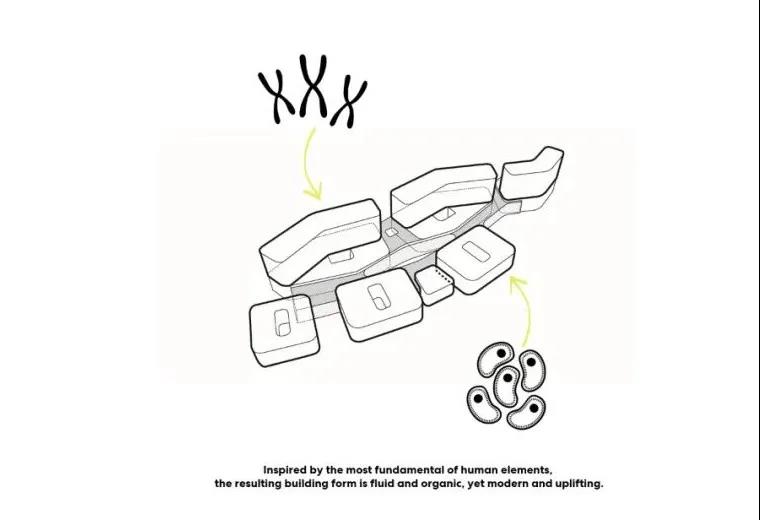 建筑的設(shè)計理念源自大自然最基本的生命元素——細胞。南側(cè)門診樓和行政樓被賦予細胞狀的外觀;北側(cè)建筑體塊的排布則模擬了細胞內(nèi)染色體的形態(tài)。建筑的朝向和角度與河道景觀交相呼應(yīng),呈現(xiàn)出律動的美感。